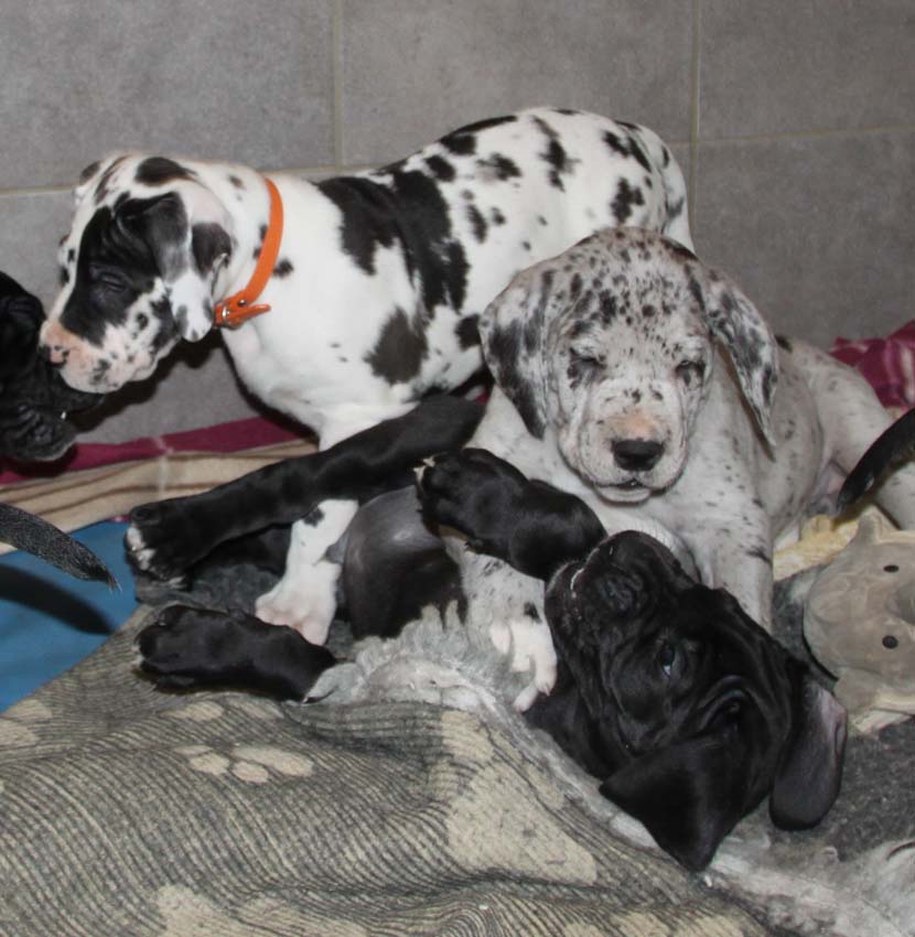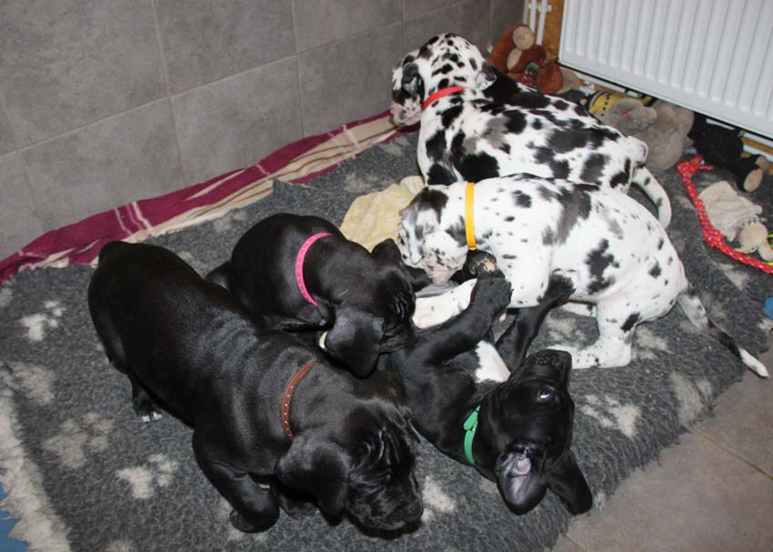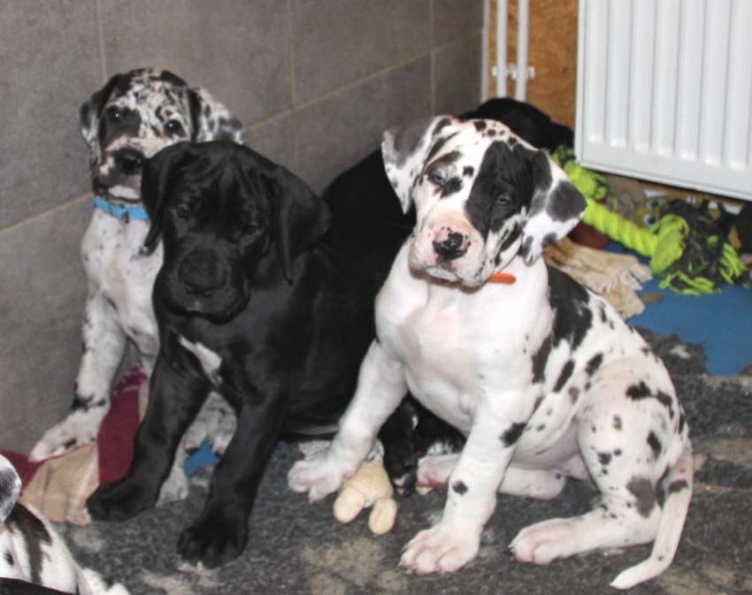 Unsere hübschen H-Kinder sind nun fast alle in ihrer neuen Heimat angekommen. Zwei sind in die Niederlande ausgewandert und dort gut angekommen. Wir freuen uns über aktuelle Fotos und wünschen den neuen Besitzern viel Freude mit ihrem Welpen. Besonders erfreulich ist, dass der Besitzer von Confetti v. Lossaer Wolfsanger, sich die kleine schwarze Hilde geholt hat. Confetti wird im März 8 Jahre alt und die Berichte einiger Doggenfreunde belegen, dass sich ein Welpe positiv auswirkt. Voraussetzung ist natürlich, dass der ältere Hund noch gesund und fit ist.